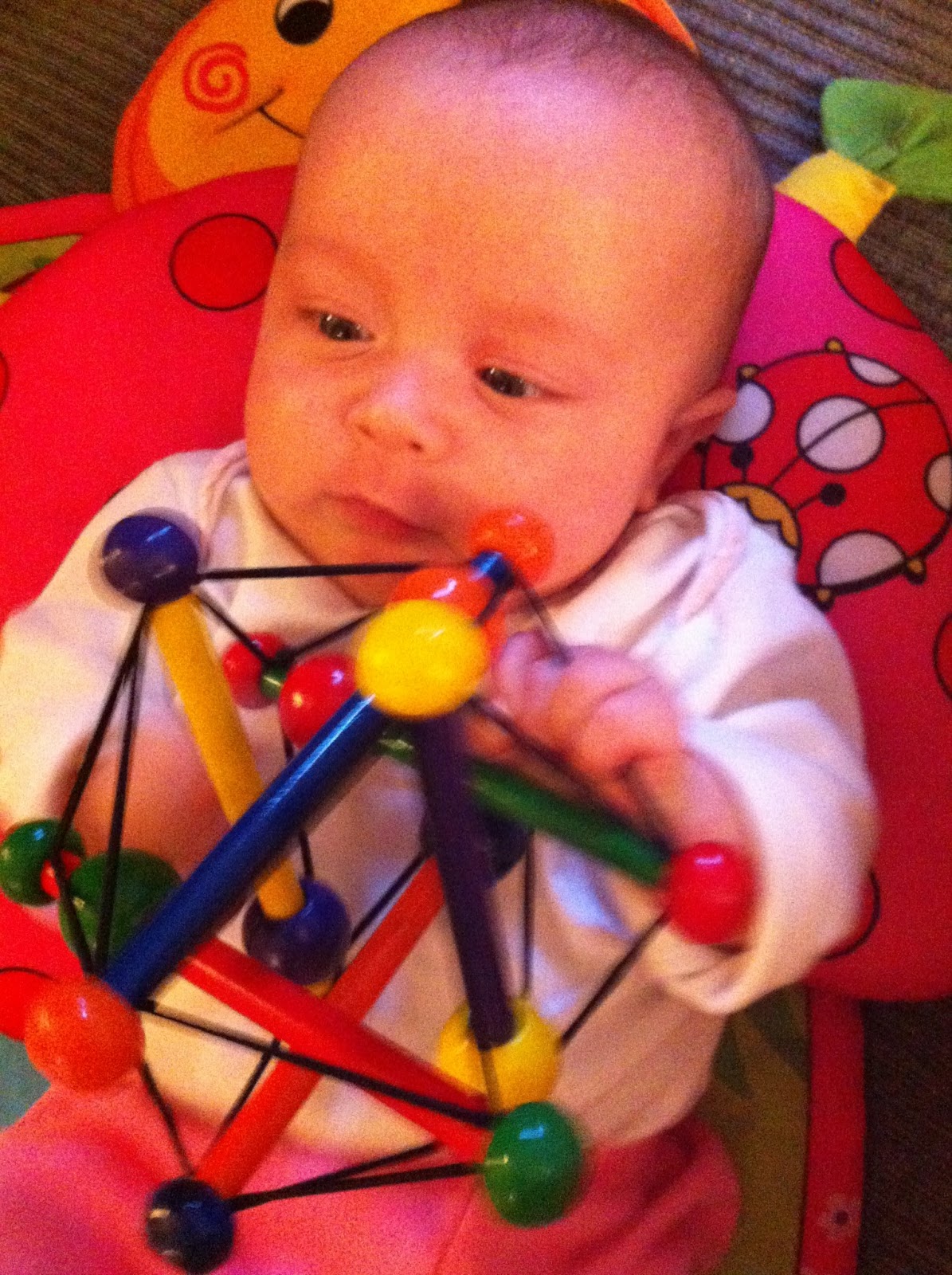 I'll close out with two photos of the chicas. Stella is on the left, Lydia is on the right. Lydia is just learning the trick of bringing her hands (and toys) up to her mouth. That nom nom nom reflex, displayed by Stella here, is really coming into full effect. I'm struck by the similarities of both girls at approximately this age. Of course, the single-minded obsession with this particular toy does heighten the likeness.